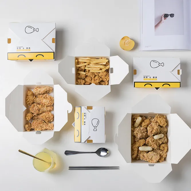 Hộp đựng gà rán là loại hộp giấy đựng gà rán được thiết kế chuyên dụng cho ngành thức ăn nhanh. Hộp đựng gà rán được làm bằng bìa cứng dùng cho thực phẩm, chịu được nhiệt độ và dầu cao, chống thấm nước và chống rò rỉ, thích hợp dùng nóng lạnh, dễ đóng gói. Đây là một hộp đựng gà rán tiện dụng với khả năng bịt kín và cách nhiệt tốt, có thể duy trì độ tươi và nhiệt độ của gà rán một cách hiệu quả. Hộp gà rán do nhà máy Zemeijia sản xuất hỗ trợ in ấn tùy chỉnh và phù hợp cho các cảnh mang đi, phục vụ ăn uống và tiệc tùng.