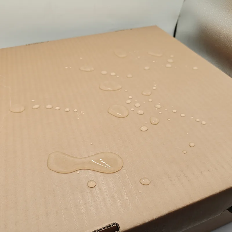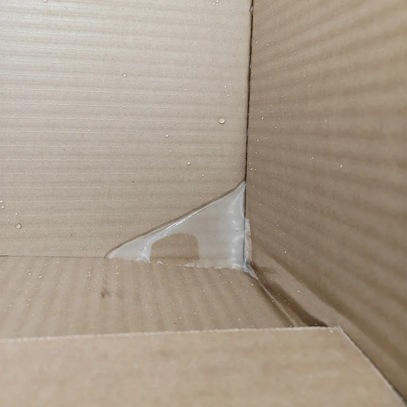 ● Đối với các trường hợp như bảo quản trong bếp, vận chuyển vào những ngày mưa và luân chuyển sản phẩm tươi sống có thể gặp nước, bên ngoài hộp được bao phủ hoàn toàn bằng màng sáp trong suốt cấp thực phẩm. Nước tương hoặc nước vô tình bị đổ ra ngoài có thể dễ dàng lau sạch bằng vải, màng sáp sẽ không bong ra hoặc để hơi ẩm thấm vào các lớp giấy khiến hộp bị mềm. Ngay cả trong trường hợp mưa rơi nhẹ trong thời gian ngắn cũng sẽ không có vết nước và độ cứng của hộp vẫn không thay đổi.
