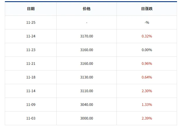 Đối với giấy gợn sóng 140g/m2, giá đã tăng 12,09% trong khoảng thời gian từ ngày 16 tháng 10 đến ngày 16 tháng 11 năm 2025. Trong khoảng thời gian dài hơn (27 tháng 8 đến 25 tháng 11), mức tăng tích lũy đạt 20,99%. Đến ngày 24 tháng 11, mức giá mới nhất đạt 3170 RMB/tấn và tiếp tục có những điều chỉnh tăng nhẹ.